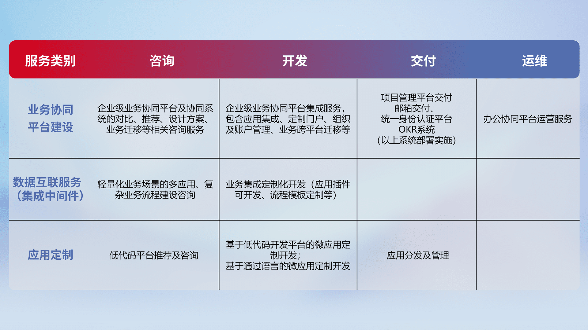 针对钉钉、、、、企微、、、IDaas等平台级产品提供产品的规划、、、方案、、、交付、、、定制化开发等服务,,实现如统一协同办公、、、智能客户服务、、、混合会议管理、、智能数据查询、、、、等业务场景,,实现数字化转型。。